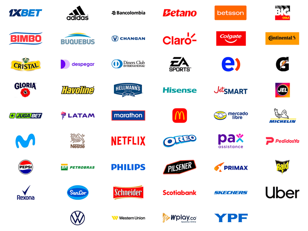 Clientes Internacionales: 1xBET, Adidas, Bancolombia, Betano, Betsson, Big Cola, Bimbo, Buquebus, Changan, Claro, Colgate, Continental, Cristal, Despegar, Diners, EA Sports, Entel, Gatorade, Gloria, Havoline, Hellmann’s, Hisense, JetSMART, Juega en Línea, Jugabet, LATAM, Marathon, McDonald’s, Mercado Libre, Michelin, Movistar, Nestlé, Netflix, Oreo, Pax Assistance, PedidosYa, Pepsi, Petrobras, Phillips, Pilsener, Primax, Raid, Rexona, Sancor, Schneider, Scotiabank, Skechers, Uber, Volkswagen, Western Union, Wplay e YPF.
